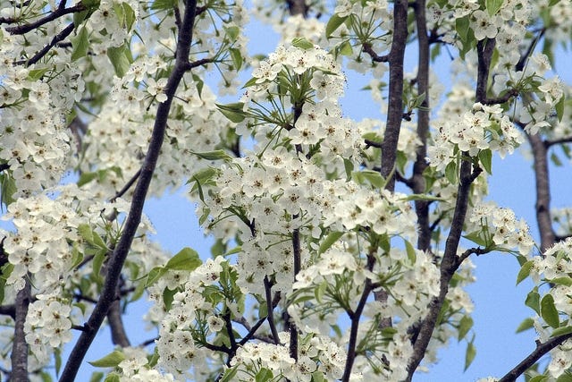 Tiny white flowers appear in March or April and like snow. White flowers grace the bare branches of pear trees Pyrus spp when they bloom from late. Wisteria will continue to bloom all summer and fall if it is pruned back to about4 bud but the pear tree blooming in autumn is weird shows the whole system of the planet is.